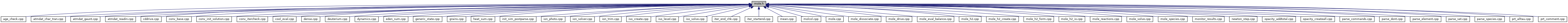 Referenced by AbundChange(), t_gaunt::brems_sum_ions(), ChemImportance(), ConvBase(), ConvIterCheck(), CoolEvaluate(), DynaStartZone(), eden_sum(), ElectronFractions(), fill_array(), fill_ext_src_and_snk(), find_solution(), findspecieslocal(), findspecieslocal_validate(), funjac(), diatomics::H2_LevelPops(), diatomics::H2_PunchDo(), diatomics::H2_X_sink_and_source(), HomogeneousSource(), diatomics::init(), InitSimPostparse(), iso_allocate(), iso_level(), isSpeciesActive(), iter_end_check(), IterRestart(), IterStart(), lgNetEdenSrcSmall(), lgNucleiConserved(), lines(), lines_molecules(), matchGeneric(), t_mean::MeanMoleculeTemp(), molcol(), mole_create_react(), mole_dominant_rates(), mole_effects(), mole_eval_balance(), mole_eval_dynamic_balance(), mole_eval_sources(), diatomics::mole_H2_form(), mole_h_fixup(), mole_h_rate_diagnostics(), mole_print_species_reactions(), mole_return_cached_species(), mole_rk_bigchange(), mole_save(), mole_solve(), mole_update_limiting_reactants(), mole_update_rks(), mole_update_species_cache(), PrintRates(), PrtComment(), PrtZone(), radius_increment(), radius_next(), RT_tau_reset(), SaveDo(), SaveSpecies(), ScaleAllDensities(), GroupMap::setup(), species_gasphase_density(), states_nelemfill(), total_molecule_deut(), total_molecule_elems(), total_molecules(), total_molecules_gasphase(), GroupMap::updateMolecules(), and zero().