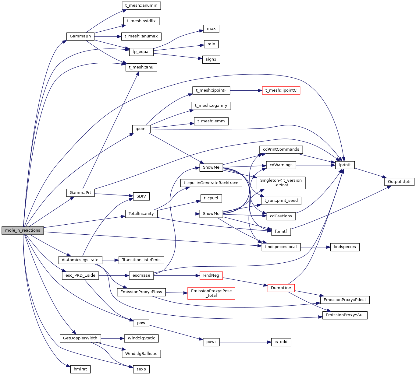 References t_mesh::anu(), ASSERT, atmdat, t_dense::AtomicWeight, t_hmi::chH2_small_model_type, molezone::column, t_rfield::ConInterOut, diatomics::Cont_Dissoc_Rate_H2g, diatomics::Cont_Dissoc_Rate_H2s, conv, DEBUG_ENTRY, molezone::den, dense, diatoms, t_dense::eden, t_atmdat::EIonPot, esc_PRD_1side(), t_hmi::exphmi, t_rfield::extin_mag_V_point, findspecieslocal(), fixit, t_rfield::flux, fnzone, fp_equal(), fprintf(), GammaBn(), GammaPrt(), GetDopplerWidth(), diatomics::gs_rate(), h2, t_hmi::H2_H2g_to_H2s_rate_BD96, t_hmi::H2_H2g_to_H2s_rate_BHT90, t_hmi::H2_H2g_to_H2s_rate_ELWERT, t_hmi::H2_H2g_to_H2s_rate_TH85, t_hmi::H2_H2g_to_H2s_rate_used, t_hmi::H2_photodissoc_BHT90, t_hmi::H2_photodissoc_ELWERT_H2g, t_hmi::H2_photodissoc_ELWERT_H2s, t_hmi::H2_photodissoc_TH85, t_hmi::H2_photodissoc_used_H2g, t_hmi::H2_photodissoc_used_H2s, t_hmi::H2_Solomon_dissoc_rate_BD96_H2g, t_hmi::H2_Solomon_dissoc_rate_BD96_H2s, t_hmi::H2_Solomon_dissoc_rate_BHT90_H2g, t_hmi::H2_Solomon_dissoc_rate_BHT90_H2s, t_hmi::H2_Solomon_dissoc_rate_ELWERT_H2g, t_hmi::H2_Solomon_dissoc_rate_ELWERT_H2s, t_hmi::H2_Solomon_dissoc_rate_TH85_H2g, t_hmi::H2_Solomon_dissoc_rate_TH85_H2s, t_hmi::H2_Solomon_dissoc_rate_used_H2g, t_hmi::H2_Solomon_dissoc_rate_used_H2s, t_hmi::H2Opacity, hd, t_phoHeat::HeatNet, hmi, t_hmi::hmicol, t_hmi::HMinus_induc_rec_cooling, t_hmi::HMinus_induc_rec_rate, t_hmi::HMinus_photo_heat, t_hmi::HMinus_photo_rate, hmirat(), ioQQQ, t_rfield::ip1000A, t_rfield::ipG0_DB96_hi, t_rfield::ipG0_DB96_lo, t_rfield::ipG0_spec_hi, t_rfield::ipG0_spec_lo, t_rfield::ipG0_TH85_hi, t_rfield::ipG0_TH85_lo, ipHELIUM, t_hmi::iphmin, t_opac::iphmop, ipHYDROGEN, ipoint(), iteration, diatomics::lgEnabled, diatomics::lgEvaluated, t_hmi::lgH2_Chemistry_BigH2, t_hmi::lgLeidenCRHack, t_mole_global::lgLeidenHack, t_mole_global::lgStancil, MAX2, mole_global, t_conv::nPres2Ioniz, t_conv::nTotalIoniz, nzone, opac, t_rfield::outlin, t_rfield::outlin_noplot, diatomics::photodissoc_BigH2_H2g, diatomics::photodissoc_BigH2_H2s, phycon, pow(), POW2, t_radius::r1r0sq, radius, diatomics::rel_pop_LTE_g, t_hmi::rel_pop_LTE_H2g, t_hmi::rel_pop_LTE_H2p, t_hmi::rel_pop_LTE_H2s, t_hmi::rel_pop_LTE_H3p, t_hmi::rel_pop_LTE_Hmin, diatomics::rel_pop_LTE_s, rfield, secondaries, sexp(), SMALLFLOAT, diatomics::Solomon_dissoc_rate_g, diatomics::Solomon_dissoc_rate_s, t_opac::TauAbsFace, t_phycon::te, t_phycon::te32, TotalInsanity(), t_hmi::UV_Cont_rel2_Draine_DB96_depth, t_hmi::UV_Cont_rel2_Draine_DB96_face, t_hmi::UV_Cont_rel2_Habing_spec_depth, t_hmi::UV_Cont_rel2_Habing_TH85_depth, t_hmi::UV_Cont_rel2_Habing_TH85_face, and t_secondaries::x12tot.