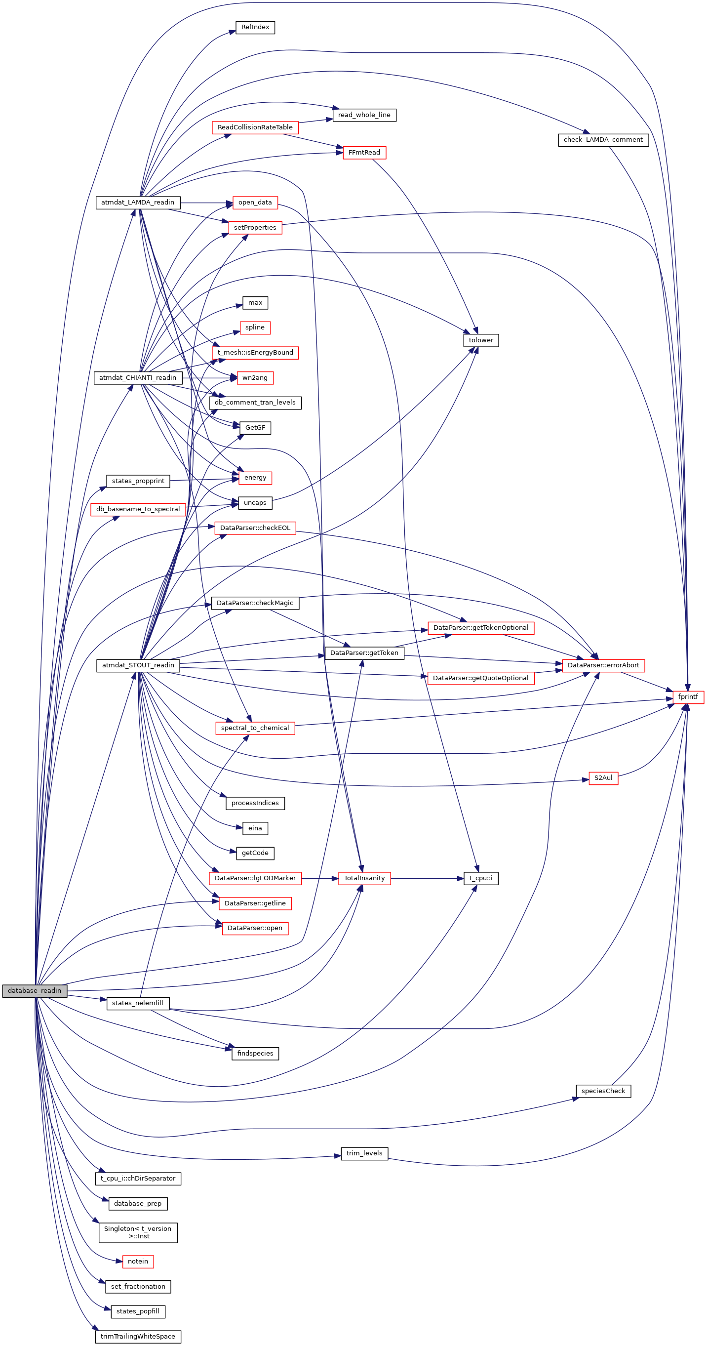References AllTransitions, ASSERT, atmdat, atmdat_CHIANTI_readin(), atmdat_LAMDA_readin(), atmdat_STOUT_readin(), AtmolCollRateCoeff, AtmolCollSplines, CHARS_SPECIES, t_atmdat::chCloudyChiantiFile, t_atmdat::chdBaseSources, t_cpu_i::chDirSeparator(), DataParser::checkEOL(), DataParser::checkMagic(), t_elementnames::chElementSym, t_atmdat::chLamdaFile, t_atmdat::chStoutFile, t_atmdat::chVersion, cpu, database_prep(), db_basename_to_spectral(), dBaseSpecies, dBaseStates, dBaseTrans, DEBUG_ENTRY, DEBUGSTATE, elementnames, DataParser::errorAbort(), ES_NONE, findspecies(), fixit, fprintf(), DataParser::getline(), DataParser::getToken(), DataParser::getTokenOptional(), t_cpu::i(), Singleton< t_version >::Inst(), ioQQQ, ipdBaseTrans, ipNCOLLIDER, t_save::ipSDSFile, t_atmdat::lgCalpgmOn, t_atmdat::lgChiantiOn, t_atmdat::lgdBaseSourceExists, t_atmdat::lgLamdaOn, t_prt::lgPrintTime, t_save::lgSDSOn, t_atmdat::lgStoutOn, LIMELM, notein(), nSpecies, null_mole, DataParser::open(), prt, save, set_fractionation(), speciesCheck(), states_nelemfill(), states_popfill(), states_propprint(), StoutCollData, TotalInsanity(), trim_levels(), and trimTrailingWhiteSpace().